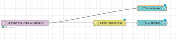 On utilise le même noeud MQTT IN pour recevoir les infos de temperature que la page precedente. (Topic = tele/tasmota_6B2128/SENSOR)