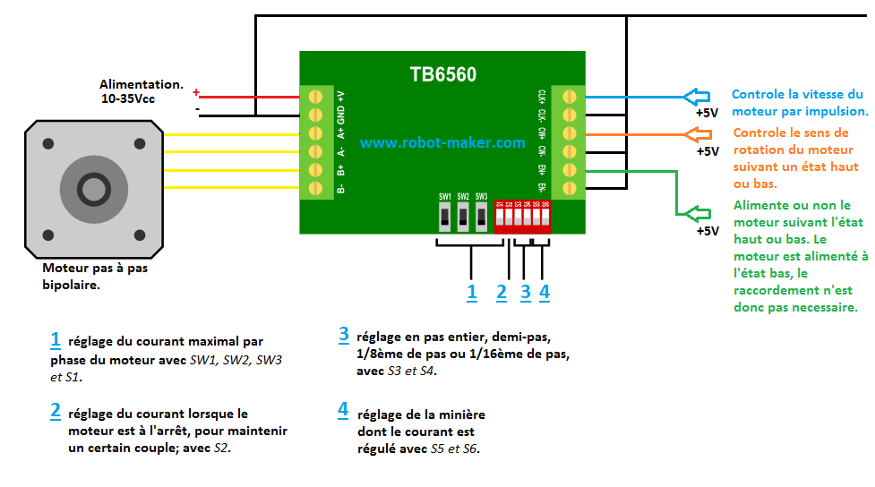 De plus, cette carte est équipée de dip switch permettant un réglage aisé et pratique des différents paramètres de pilotage du moteur dont le courant par phase et la méthode d'excitation pouvant en théorie aller jusqu'à du 16ème de pas. Cependant en pratique, il est préférable de piloter le moteur en 8ème voir en quart de pas.