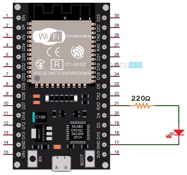 Avec toutes les informations nécessaires sur PWM dans ESP32, nous pouvons maintenant procéder à la mise en œuvre de notre premier projet de décoloration d'une LED à l'aide de ESP32 PWM. C'est un projet très simple où la luminosité d'une LED connectée à une broche GPIO d'ESP32 augmentera et diminuera progressivement à plusieurs reprises. [ Projets ESP32 pour débutants ]