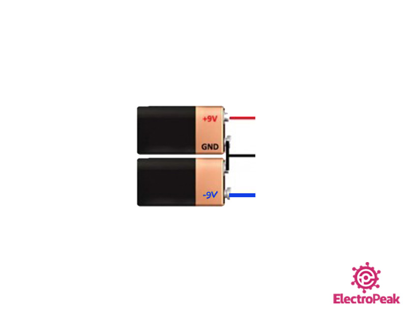 Nous utilisons deux alimentations ou batteries pour générer +Vs et -Vs. Connectez d'abord le côté négatif de la première batterie au côté positif de la deuxième batterie, comme indiqué ci-dessous. Cela crée une masse électrique pour l'alimentation électrique.