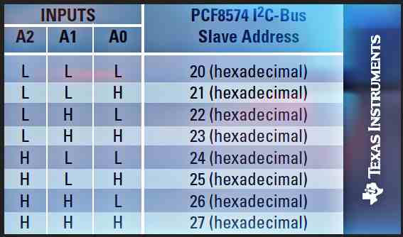 Les trois broches d'adresse matérielle permettent à huit de chaque appareil d'être sur le même bus I 2 C, il peut donc y avoir jusqu'à 16 de ces extenseurs d'E/S PCF8574/PCF8574A ensemble sur le même bus I2C, prenant en charge jusqu'à 128 I/Os.