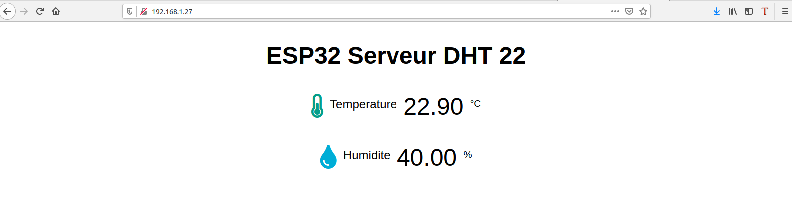 /********* Rui Santos Complete project details at https://randomnerdtutorials.com *********/ // Import required libraries #include "WiFi.h" #include "ESPAsyncWebServer.h" #include <Adafruit_Sensor.h> #include <DHT.h> // Replace with your network credentials const char* ssid = "xxxxxxxxxxxx"; const char* password = "xxxxxxxxxxxxxx"; #define DHTPIN 13 // Digital pin connected to the DHT sensor // Uncomment the type of sensor in use: //#define DHTTYPE DHT11 // DHT 11 #define DHTTYPE DHT22 // DHT 22 (AM2302) //#define DHTTYPE DHT21 // DHT 21 (AM2301) DHT dht(DHTPIN, DHTTYPE); // Create AsyncWebServer object on port 80 AsyncWebServer server(80); String readDHTTemperature() { // Sensor readings may also be up to 2 seconds 'old' (its a very slow sensor) // Read temperature as Celsius (the default) float t = dht.readTemperature(); // Read temperature as Fahrenheit (isFahrenheit = true) //float t = dht.readTemperature(true); // Check if any reads failed and exit early (to try again). if (isnan(t)) { Serial.println("Failed to read from DHT sensor!"); return "--"; } else { Serial.println(t); return String(t); } } String readDHTHumidity() { // Sensor readings may also be up to 2 seconds 'old' (its a very slow sensor) float h = dht.readHumidity(); if (isnan(h)) { Serial.println("Failed to read from DHT sensor!"); return "--"; } else { Serial.println(h); return String(h); } } const char index_html[] PROGMEM = R"rawliteral( <!DOCTYPE HTML><html> <head> <meta name="viewport" content="width=device-width, initial-scale=1"> <link rel="stylesheet" href="https://use.fontawesome.com/releases/v5.7.2/css/all.css" integrity="sha384-fnmOCqbTlWIlj8LyTjo7mOUStjsKC4pOpQbqyi7RrhN7udi9RwhKkMHpvLbHG9Sr" crossorigin="anonymous"> <style> html { font-family: Arial; display: inline-block; margin: 0px auto; text-align: center; } h2 { font-size: 3.0rem; } p { font-size: 3.0rem; } .units { font-size: 1.2rem; } .dht-labels{ font-size: 1.5rem; vertical-align:middle; padding-bottom: 15px; } </style> </head> <body> <h2>ESP32 Serveur DHT 22</h2> <p> <i class="fas fa-thermometer-half" style="color:#059e8a;"></i> <span class="dht-labels">Temperature</span> <span id="temperature">%TEMPERATURE%</span> <sup class="units">°C</sup> </p> <p> <i class="fas fa-tint" style="color:#00add6;"></i> <span class="dht-labels">Humidite</span> <span id="humidity">%HUMIDITY%</span> <sup class="units">%</sup> </p> </body> <script> setInterval(function ( ) { var xhttp = new XMLHttpRequest(); xhttp.onreadystatechange = function() { if (this.readyState == 4 && this.status == 200) { document.getElementById("temperature").innerHTML = this.responseText; } }; xhttp.open("GET", "/temperature", true); xhttp.send(); }, 10000 ) ; setInterval(function ( ) { var xhttp = new XMLHttpRequest(); xhttp.onreadystatechange = function() { if (this.readyState == 4 && this.status == 200) { document.getElementById("humidity").innerHTML = this.responseText; } }; xhttp.open("GET", "/humidity", true); xhttp.send(); }, 10000 ) ; </script> </html>)rawliteral"; // Replaces placeholder with DHT values String processor(const String& var){ //Serial.println(var); if(var == "TEMPERATURE"){ return readDHTTemperature(); } else if(var == "HUMIDITY"){ return readDHTHumidity(); } return String(); } void setup(){ // Serial port for debugging purposes Serial.begin(115200); dht.begin(); // Connect to Wi-Fi WiFi.begin(ssid, password); while (WiFi.status() != WL_CONNECTED) { delay(1000); Serial.println("Connecting to WiFi.."); } // Print ESP32 Local IP Address Serial.println(WiFi.localIP()); // Route for root / web page server.on("/", HTTP_GET, [](AsyncWebServerRequest *request){ request->send_P(200, "text/html", index_html, processor); }); server.on("/temperature", HTTP_GET, [](AsyncWebServerRequest *request){ request->send_P(200, "text/plain", readDHTTemperature().c_str()); }); server.on("/humidity", HTTP_GET, [](AsyncWebServerRequest *request){ request->send_P(200, "text/plain", readDHTHumidity().c_str()); }); // Start server server.begin(); } void loop(){ }