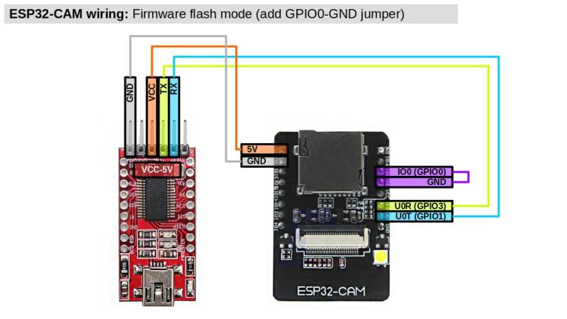 Connectez votre caméra ESP32 à l'adaptateur USB à TTL/série en mode flash: