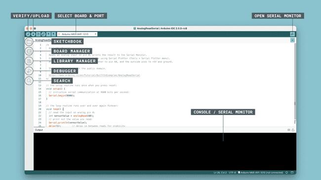 Dans ce guide, nous couvrirons les bases de l'IDE Arduino 2.0, où vous trouverez des liens vers des ressources plus détaillées sur l'utilisation de fonctionnalités spécifiques !