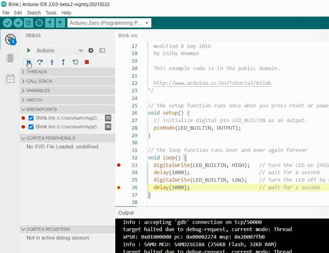 L'Arduino IDE 2.0 est un éditeur polyvalent avec de nombreuses fonctionnalités. Vous pouvez installer des bibliothèques directement, synchroniser vos croquis avec Arduino Cloud, déboguer vos croquis et bien plus encore. Dans cette section, certaines des fonctionnalités principales sont répertoriées, ainsi qu'un lien vers un article plus détaillé.