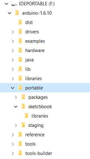 L'arborescence doit être comme celle-ci ; le dossier portable sera rempli par le logiciel Arduino (IDE) selon les besoins des bibliothèques, des croquis et des cœurs.