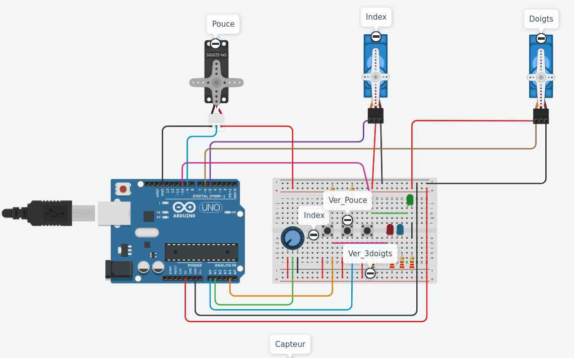 #include <Servo.h> //Pin int pinButtonCalib; //start calibration int pinButtonTBD; // No function implemented yet. int pinButtonThumb; // open/close thumb int pinButtonOther; //lock/unlock other three fingers int pinServoIndex; int pinServoOther; int pinServoThumb; int pinSensor; //sensor input //Software int sensorValue = 0; int memPouce = 0; int memIndex = 0; int mem3Dgts = 0; //Hardware Servo servoIndex; //index Servo servoOther; //3doigts Servo servoThumb; //pouce //Valeurs mini/max servos const int outThumbMax = 170;//valeur max servo pouce const int outIndexMax = 142;//valeur max servo index const int outOtherMax = 96;//valeur max servo 3doigts const int outThumbMin = 170-86;//valeur min servo pouce 170-86=84 const int outIndexMin = 140-117; //valeur min servo index 140-117= 23 const int outOtherMin = 95-55;//valeur min servo 3doigts 95-55 = 40 void setup() { Serial.begin(9600); // Pin Configuration pinButtonCalib = A4;// A6 sur Hackberry pour test Calibration -- validation index pinButtonTBD = A5;// A7 sur Hackberry pour test pinButtonThumb = A0;// Verrouillage pouce -- validation pouce pinButtonOther = 10;// Verouillage 3 doigts -- validation 3doigts pinServoIndex = 5;// Servo pour l'index pinServoOther = 6;// Servo pour 3 doigts pinServoThumb = 9;// Servo pour le pouce pinSensor = A1; // Capteur de pression servoIndex.attach(pinServoIndex);//index servoOther.attach(pinServoOther);// 3 doigts servoThumb.attach(pinServoThumb);//Pouce pinMode(pinButtonCalib, INPUT_PULLUP); pinMode(pinButtonTBD, INPUT_PULLUP); pinMode(pinButtonThumb, INPUT_PULLUP); pinMode(pinButtonOther, INPUT_PULLUP); } void loop() { sensorValue = 0; if ( digitalRead(pinButtonThumb) == HIGH ){ memPouce = 1; memIndex = 0; mem3Dgts = 0; } if ( digitalRead(pinButtonCalib) == HIGH ){ memPouce = 0; mem3Dgts = 0; memIndex = 1; } if ( digitalRead(pinButtonOther) == HIGH ){ memPouce = 0; mem3Dgts = 1; memIndex = 0; } if (memPouce == 1){ sensorValue = analogRead(pinSensor); delay(25); sensorValue = map(sensorValue, 0, 1023, outThumbMin, outThumbMax); Serial.print("sensor pouce= "); Serial.println(sensorValue); servoThumb.write(sensorValue); delay(15); } if (memIndex == 1){ sensorValue = analogRead(pinSensor); delay(25); sensorValue = map(sensorValue, 0, 1023,outIndexMin, outIndexMax); Serial.print("sensor index= "); Serial.println(sensorValue); servoIndex.write(sensorValue); delay(15); } if (mem3Dgts == 1){ sensorValue = analogRead(pinSensor); delay(25); sensorValue = map(sensorValue, 0, 1023,outOtherMin, outOtherMax); Serial.print("sensor doigts= "); Serial.println(sensorValue); servoOther.write(sensorValue); delay(15); } }