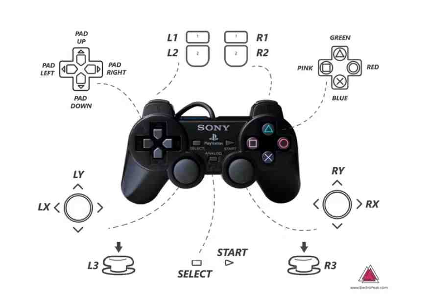 #include <PS2X_lib.h> /* PS2 Controller Library */ PS2X ps2x; /* create PS2 Controller Class*/ byte Type = 0; byte vibrate = 0; int rx=0,ry=0,lx=0,ly=0; void setup(){ Serial.begin(9600); ps2x.config_gamepad(13,11,10,12, true, true); /* setup pins and settings: GamePad(clock, command, attention, data, Pressures?, Rumble?) check for error*/ Type = ps2x.readType(); /* Reading type of the PS2 Ccontroller */ if(Type==1){ /* Type 1 is Duel shock controller */ Serial.println(" DualShock "); /* display if the controller is duel shock*/ Serial.println("Controller Found"); delay(1000); } } void loop(){ ps2x.read_gamepad(false, vibrate); /* read controller and set large motor to spin at 'vibrate' speed */ Serial.println("Stick values: "); /* Display analog stick values */ ly = ps2x.Analog(PSS_LY); /* Reading Left stick Y axis */ lx = ps2x.Analog(PSS_LX); /* Reading Left stick X axis */ ry = ps2x.Analog(PSS_RY); /* Reading Right stick Y axis */ rx = ps2x.Analog(PSS_RX); /* Reading Right stick X axis */ if((ly <= 9)) /* standardize to 3 digit by checking less than 10 */ Serial.println("00"); /* eg: if ly= 5 then it display as "005" in Serial */ if((ly >= 9 &&ly <= 99)) /* standardize to 3 digit by checking between 10-99 */ Serial.print("0"); /* eg: if ly= 55 then it display as "055" in Serial */ Serial.println(ly,DEC); /* display left analog stick Y axis */ Serial.print(","); /* separate values using comma */ if((lx <= 9)) /* standardize to 3 digit by checking less than 10 */ Serial.print("00"); /* eg: if lx= 5 then it display as "005" in Serial */ if((lx >= 9 && lx<=99)) /* standardize to 3 digit by checking between 10-99 */ Serial.println("0"); /* eg: if lx= 55 then it display as "055" in Serial */ Serial.println(lx,DEC); /* display left analog stick X axis */ Serial.print(","); /* separate values using comma */ if((ry <= 9)) /* standardize to 3 digit by checking less than 10 */ Serial.println("00"); /* eg: if rx= 5 then it display as "005" in Serial */ if((ry >= 9 &&rx<=99)) /* standardize to 3 digit by checking between 10-99 */ Serial.println("0"); /* eg: if rx= 55 then it display as "055" in Serial */ Serial.println(ry,DEC); /* display Right analog stick Y axis */ Serial.println(","); /* separate values using comma */ if((rx <= 9)) /* standardize to 3 digit by checking less than 10 */ Serial.println("00"); /* eg: if RX= 5 then it display as "005" in Serial */ if((rx >= 9 &&rx <= 99)) /* standardize to 3 digit by checking between 10-99 */ Serial.println("0"); /* eg: if RX= 55 then it display as "055" in Serial */ Serial.println(rx,DEC); /* display Right analog stick X axis */ Serial.println(" "); if(ps2x.NewButtonState()) { /* will be TRUE if any button changes state */ if(ps2x.Button(PSB_START)) /* will be TRUE as long START button is pressed */ Serial.println("START PRESSED "); if(ps2x.Button(PSB_SELECT)) /* will be TRUE as long SELECT button is pressed */ Serial.println("SELECT PRESSED "); if(ps2x.Button(PSB_PAD_UP)) /* will be TRUE as long as UP button is pressed */ Serial.println("UP PRESSED "); if(ps2x.Button(PSB_PAD_RIGHT)) /* will be TRUE as long as UP button is pressed */ Serial.println("RIGHT PRESSED "); if(ps2x.Button(PSB_PAD_LEFT)) /* will be TRUE as long as LEFT button is pressed */ Serial.println("LEFT PRESSED "); if(ps2x.Button(PSB_PAD_DOWN)) /* will be TRUE as long as DOWN button is pressed */ Serial.println("DOWN PRESSED "); if(ps2x.Button(PSB_L1)) /* will be TRUE as long as L1 button is pressed */ Serial.println("L1 pressed "); if(ps2x.Button(PSB_R1)) /* will be TRUE as long as R1 button is pressed */ Serial.println("R1 pressed "); if(ps2x.Button(PSB_L2)) /* will be TRUE as long as L2 button is pressed */ Serial.println("L2 pressed "); if(ps2x.Button(PSB_R2)) /* will be TRUE as long as R2 button is pressed */ Serial.println("R2 pressed "); if(ps2x.Button(PSB_L3)) /* will be TRUE as long as L3 button is pressed */ Serial.println("L3 pressed "); if(ps2x.Button(PSB_R3)) /* will be TRUE as long as R3 button is pressed */ Serial.println("R3 pressed "); if(ps2x.Button(PSB_GREEN)) /* will be TRUE as long as GREEN/Triangle button is pressed */ Serial.println("Triangle pressed"); if(ps2x.Button(PSB_BLUE)) /* will be TRUE as long as BLUE/CROSS/X button is pressed */ Serial.println("X pressed "); if(ps2x.Button(PSB_RED)) /* will be TRUE as long as RED/Circle button is pressed */ Serial.println("Circle pressed "); if(ps2x.Button(PSB_PINK)) /* will be TRUE as long as PINK/Squre button is pressed */ Serial.println("Square pressed "); delay(700); } else; }