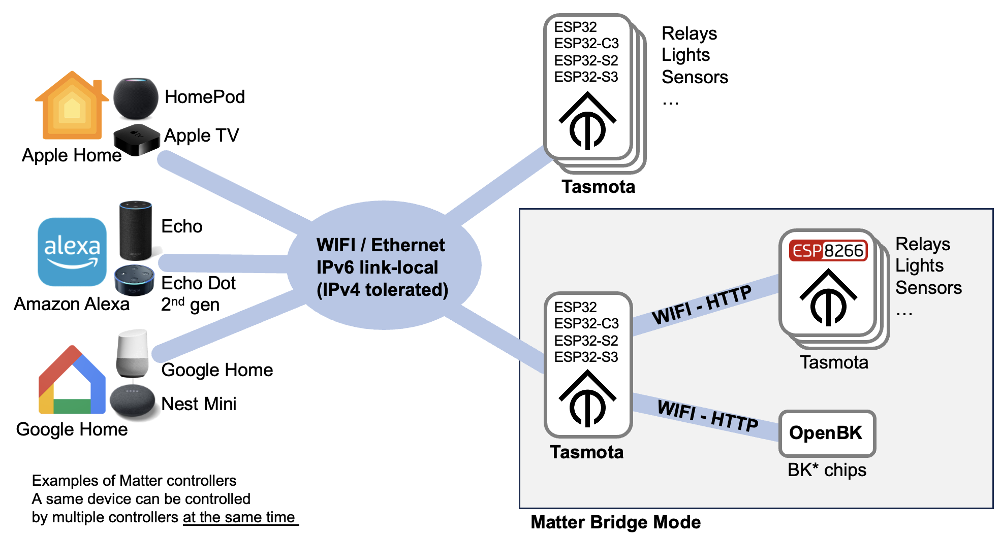 Matter ne peut pas être directement pris en charge sur ESP8266 en raison de ressources mémoire limitées, mais vous pouvez utiliser un appareil ESP32 comme pont Matter vers d'autres appareils Tasmota et OpenBK .