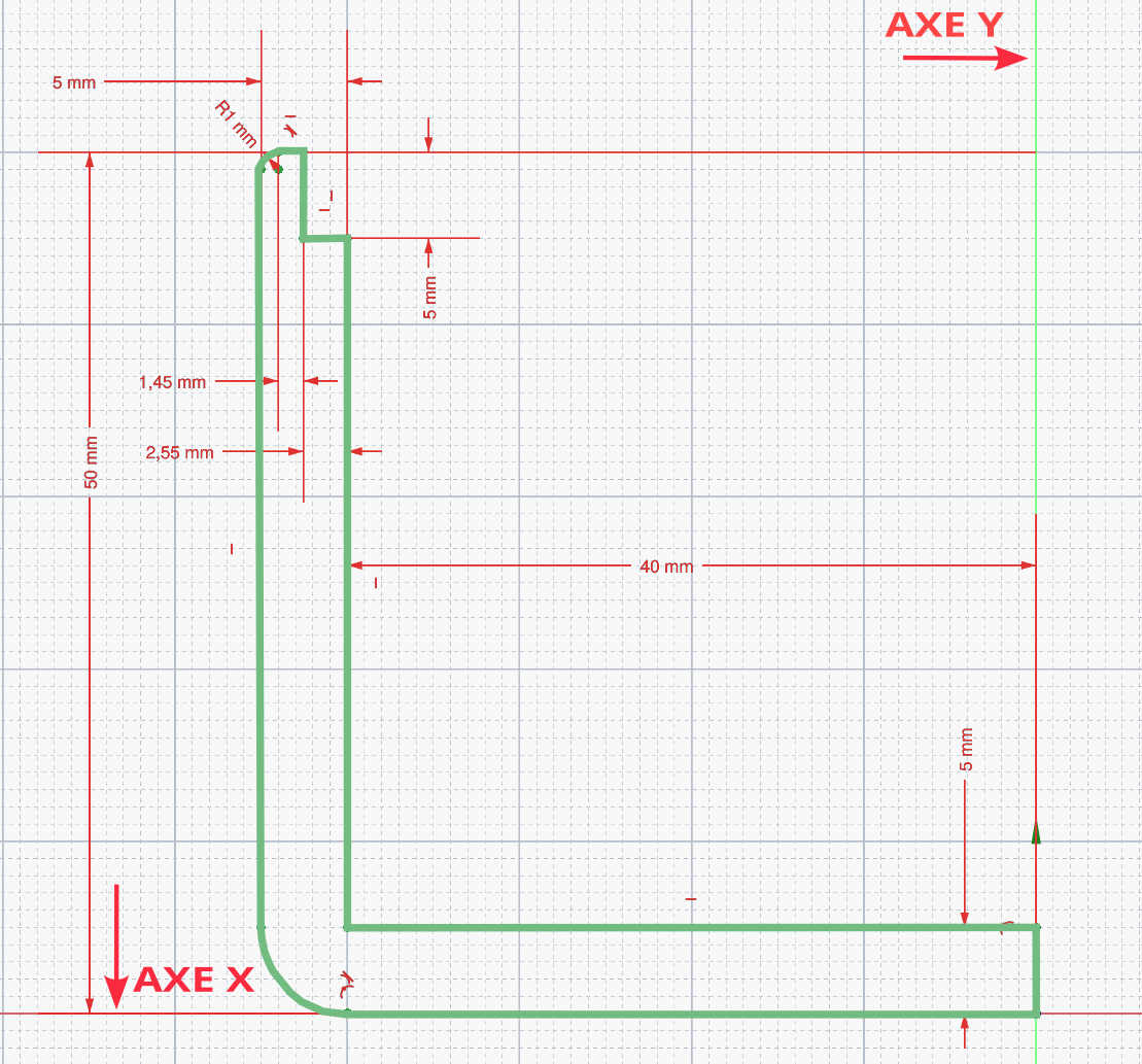 - Reproduire le dessin si dessus avec la fonction Polyligne à gauche de l'axe Y et en haut de l'axe X, avec les dimensions approximatives
