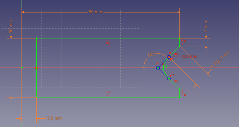 Afin d’obtenir une esquisse entièrement contrainte (symbolisée par la couleur verte) nous devons ajouter des contraintes sur le même principe. La force de l’éditeur de fonction est que vous pouvez y saisir des formules mathématiques faisant référence à vos variables.