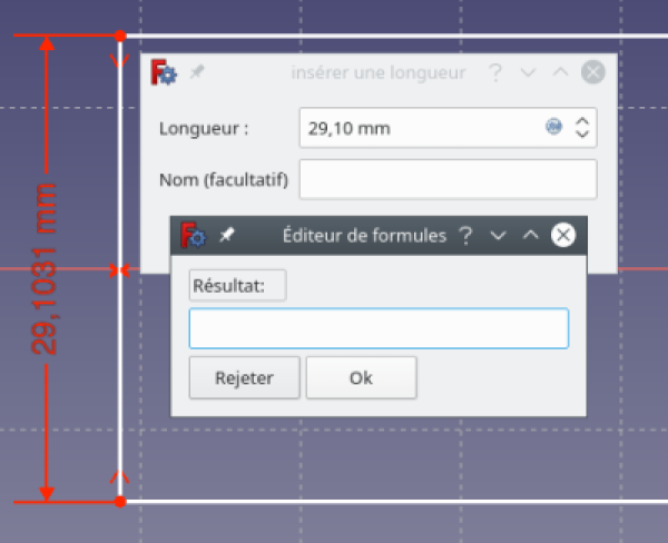 Nous retournons modifier notre esquisse et allons y ajouter cette fois les contraintes liées aux variables. Par exemple nous fixons la distance verticale du segment vertical gauche de notre esquisse, mais au lieu de saisir la valeur numérique, nous cliquons sur le symbole f(x) situé à droite du champs de saisie pour afficher un éditeur de formule.