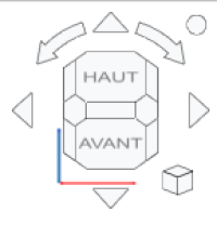 En haut à gauche de la zone graphique,se trouve le cube de navigation. Il permet de pivoter les objets selon différentes directions, ou encore d’afficher les objets selon un plan de projection particulier (Vue de face, de droite, de dessus…)