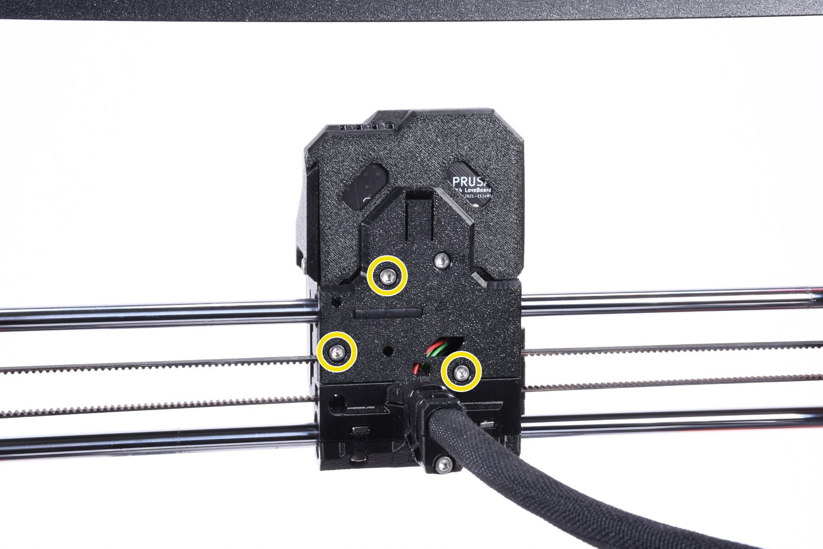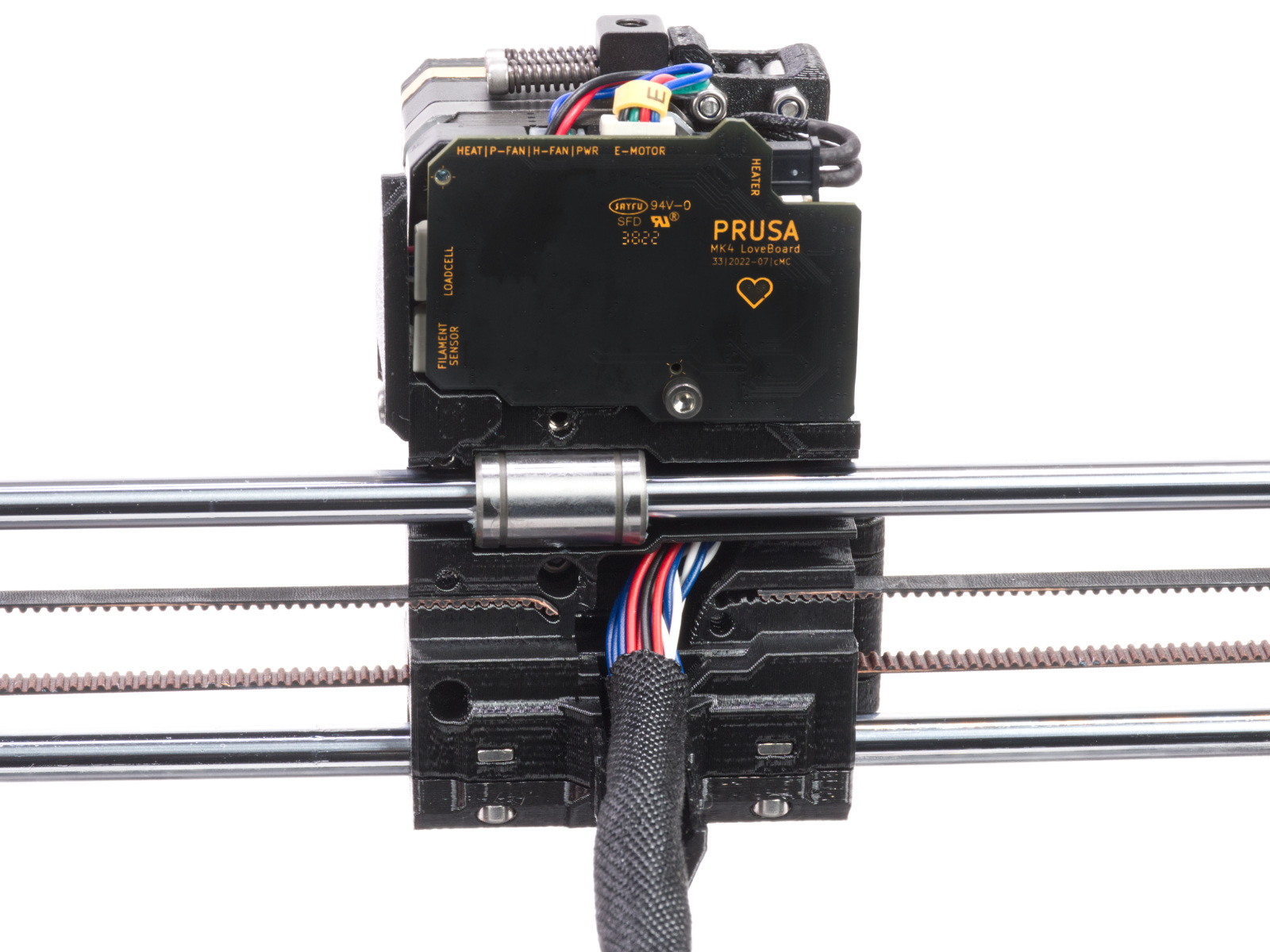 Le Nextruder contient également une carte électronique d'interconnexion avec des connecteurs pour toutes les pièces de l'extrudeur. Cela signifie que tous les ventilateurs, thermistances et autres pièces sont connectés à la carte. Ensuite, un seul faisceau de câbles relie l'électronique du Nextruder à la carte mère principale (xBuddy). Cela rend le remplacement des pièces de l'extrudeur beaucoup plus rapide. Le Nextruder est plus léger que l'extrudeur de la MK3 et son centre de gravité est plus proche des tiges de l'axe X, améliorant ainsi les performances globales. À l'intérieur du Nextruder, il y a un tout nouveau réducteur planétaire relié à un grand engrenage d'entraînement qui pousse le filament dans la buse.