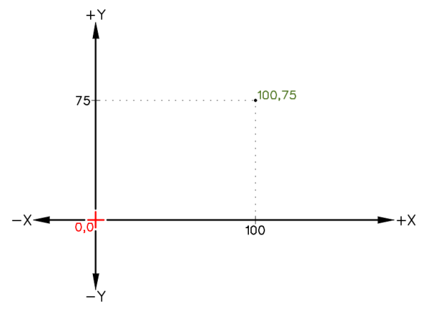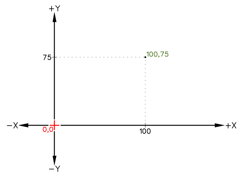 Les coordonnées cartésiennes sont les plus usuellement utilisées dans les logiciels de CAO, le X correspondant à l'axe horizontal et le Y à l'axe vertical. Dans Librecad, il suffit d'utiliser une virgule séparatrice pour utiliser ce système: le point ci-dessous est placé en “100,75” .