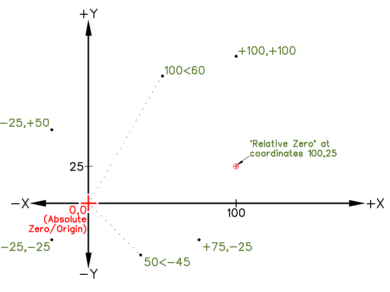 Comme dit plus haut, il est possible de travailler selon une origine absolue (un point de coordonnées 0,0 qui ne changera jamais), notion assez traditionnelle dans les logiciels de dessin cités plus avant. Néanmoins, Librecad permet de travailler avec un zéro relatif. La mire rouge visible sur le plan de travail qui le matérialise se place automatiquement au dernier point dessiné sur le plan de travail. Il est également possible de le déplacer manuellement (“Set relative zéro position” ou rz en ligne de commande). En ligne de commande, pour se référer au zéro relatif, il faut faire précéder les coordonnées d'une arobase.