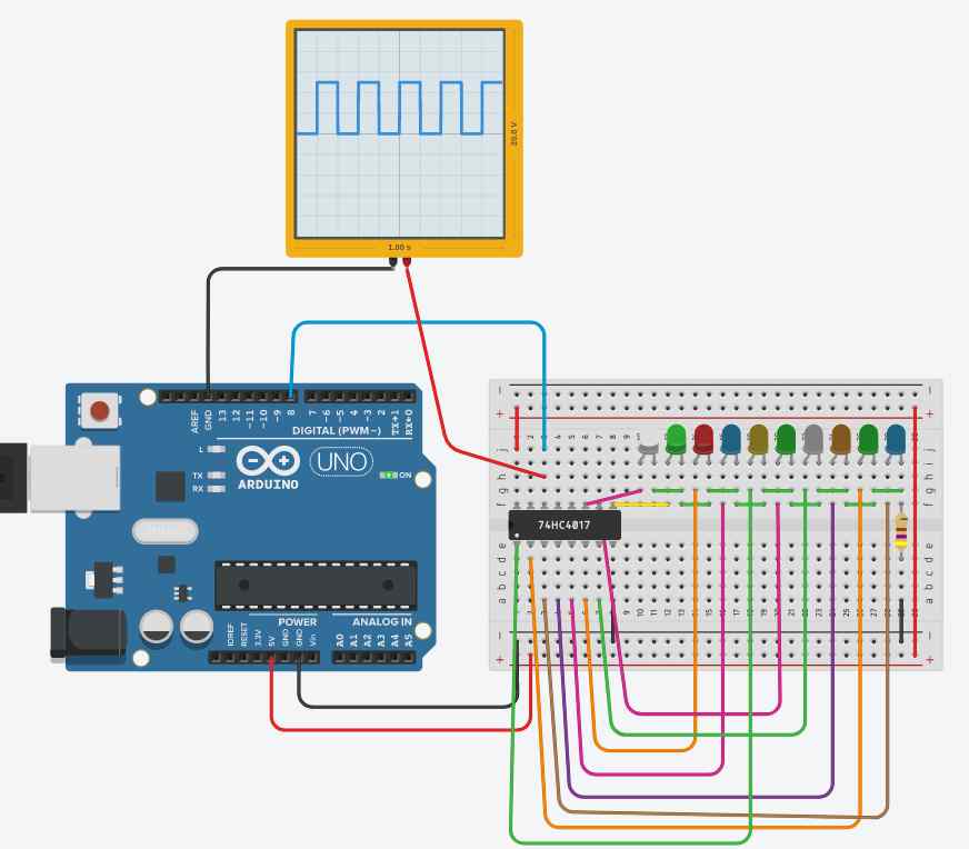 Avec un arduino en raccordant une broche de sortie ( exemple 8) sur l'entree Horloge du cd4017
