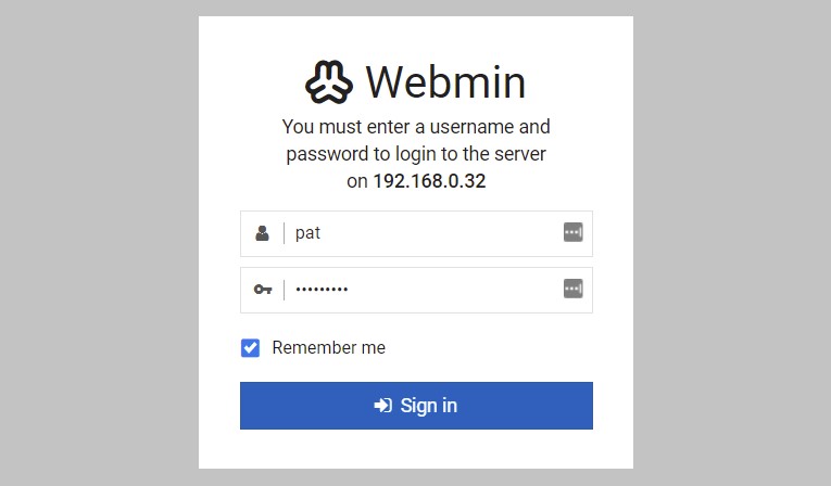 Vous obtiendrez un formulaire de connexion avec le logo Webmin.