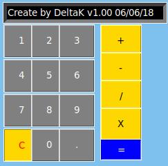 #/////////////////////////////////////////////////////////////////////////////////////////////////////////////////////////////////////////////////////////// # CALCULATRICR (GRAPHIQUE) #\\\\\\\\\\\\\\\\\\\ #-------------- #IMMPORTATION : #-------------- from tkinter import * # Tkinter #--------- # CLASSE : #--------- class Calculator(): def __init__(self): # Construction self.phase1 = 0 # Premier nombre self.phase2 = 0 # Deuxième nombre self.final = 0 # Valeur finale self.entry = StringVar() # Capte les valeurs écrit self.text = "" # Nombre écrir par l'utilisateur self.signe = "" # Type d'opération self.entry.set("Create by DeltaK v1.00 06/06/18") def init(self): # Initialisation self.phase1 = 0 # Premier nombre self.phase2 = 0 # Deuxième nombre self.final = 0 # Valeur finale self.text = "" # Nombre écrir par l'utilisateur self.signe = "" # Type d'opération def afficher_Nb(self): # Afficher les nombre sur écran self.entry.set(self.text) def operation(self): # Vérification du type d'opération try : if "+" in self.text: self.Plus() elif "-" in self.text: self.Sous() elif "/" in self.text: self.Div() elif "X" in self.text: self.Mult() except: self.entry.set("ERROR") self.init() def Plus(self): # Addition nb = self.text.split("+") self.phase1 = float(nb[0]) self.phase2 = float(nb[1]) self.final = self.phase1 + self.phase2 self.entry.set(str(self.final)) self.init() def Sous(self): # Soustraction nb = self.text.split("-") self.phase1 = float(nb[0]) self.phase2 = float(nb[1]) self.final = self.phase1 - self.phase2 self.entry.set(str(self.final)) self.init() def Div(self): # Division nb = self.text.split("/") self.phase1 = float(nb[0]) self.phase2 = float(nb[1]) self.final = self.phase1 / self.phase2 self.entry.set(str(self.final)) self.init() def Mult(self): # Multiplication nb = self.text.split("X") self.phase1 = float(nb[0]) self.phase2 = float(nb[1]) self.final = self.phase1 * self.phase2 self.entry.set(str(self.final)) self.init() #------------ # FONCTIONS : #------------ def Button1 (): # Actionnerle bouton 1 calculatrice.text += "1" calculatrice.entry.set(calculatrice.text) def Button2 (): # Actionnerle bouton 2 calculatrice.text += "2" calculatrice.entry.set(calculatrice.text) def Button3 (): # Actionnerle bouton 3 calculatrice.text += "3" calculatrice.entry.set(calculatrice.text) def Button4 (): # Actionnerle bouton 4 calculatrice.text += "4" calculatrice.entry.set(calculatrice.text) def Button5 (): # Actionnerle bouton 5 calculatrice.text += "5" calculatrice.entry.set(calculatrice.text) def Button6 (): # Actionnerle bouton 6 calculatrice.text += "6" calculatrice.entry.set(calculatrice.text) def Button7 (): # Actionnerle bouton 7 calculatrice.text += "7" calculatrice.entry.set(calculatrice.text) def Button8 (): # Actionnerle bouton 8 calculatrice.text += "8" calculatrice.entry.set(calculatrice.text) def Button9 (): # Actionnerle bouton 9 calculatrice.text += "9" calculatrice.entry.set(calculatrice.text) def Button0 (): # Actionnerle bouton 0 calculatrice.text += "0" calculatrice.entry.set(calculatrice.text) def ButtonF(): # Actionnerle bouton F calculatrice.text += "." calculatrice.entry.set(calculatrice.text) def ButtonP (): # Actionnerle bouton P calculatrice.text += "+" calculatrice.entry.set(calculatrice.text) def ButtonS (): # Actionnerle bouton S calculatrice.text += "-" calculatrice.entry.set(calculatrice.text) def ButtonD (): # Actionnerle bouton D calculatrice.text += "/" calculatrice.entry.set(calculatrice.text) def ButtonM (): # Actionnerle bouton M calculatrice.text += "X" calculatrice.entry.set(calculatrice.text) def ButtonE (): # Actionnerle bouton E calculatrice.operation() def ButtonC (): # Actionnerle bouton c calculatrice.entry.set("") calculatrice.init() #---------- # FENETRE : #---------- fen = Tk() # Création de a fenêtr 1e fen.geometry("200x240") # Définition de la fenêtre fen.title("Calculatrice v1.0") # Titre de la calculatrice fen["bg"]= "SkyBlue2" # Coleur de la fenêtre fen["relief"] = "raised" # Profondeur de la fenêtre #------------ # PROGRAMME : #------------ # Création instance calculatrice = Calculator() # ATTRIBUTS DE LA FENETRE ######################### # // Ecran calculatrice // ECRAN = Entry(fen, width=28, textvariable=calculatrice.entry, bg ="black", fg="white", relief=SUNKEN, bd=5).place(x=9, y=8) # // Bouttons // B1 = Button(fen, text="1", command=Button1, width=3, height=2, bg="grey", fg="white").place(x=10, y=40) # Boutton 1 B2 = Button(fen, text="2", command=Button2, width=3, height=2, bg="grey", fg="white").place(x=50, y=40) # Boutton 2 B3 = Button(fen, text="3", command=Button3, width=3, height=2, bg="grey", fg="white").place(x=90, y=40) # Boutton 3 B4 = Button(fen, text="4", command=Button4, width=3, height=2, bg="grey", fg="white").place(x=10, y=90) # Boutton 4 B5 = Button(fen, text="5", command=Button5, width=3, height=2, bg="grey", fg="white").place(x=50, y=90) # Boutton 5 B6 = Button(fen, text="6", command=Button6, width=3, height=2, bg="grey", fg="white").place(x=90, y=90) # Boutton 6 B7 = Button(fen, text="7", command=Button7, width=3, height=2, bg="grey", fg="white").place(x=10, y=140) # Boutton 7 B8 = Button(fen, text="8", command=Button8, width=3, height=2, bg="grey", fg="white").place(x=50, y=140) # Boutton 8 B9 = Button(fen, text="9", command=Button9, width=3, height=2, bg="grey", fg="white").place(x=90, y=140) # Boutton 9 BC = Button(fen, text="C", command=ButtonC, width=3, height=2, bg="gold", fg="red", relief=RIDGE).place(x=10, y=190) # Boutton C (Clear) B0 = Button(fen, text="0", command=Button0, width=3, height=2, bg="grey", fg="white").place(x=50, y=190) # Boutton 0 BF = Button(fen, text=".", command=ButtonF, width=3, height=2, bg="grey", fg="white").place(x=90, y=190) # Boutton = (égale) BP = Button(fen, text="+", command=ButtonP, width=4, height=2, bg="gold", fg="black", relief=GROOVE).place(x=150, y=40) # Boutton + (addition) BS = Button(fen, text="-", command=ButtonS, width=4, height=2, bg="gold", fg="bla