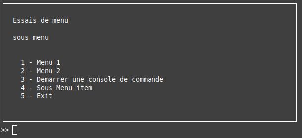 # Import the necessary packages # pip install console-menu # Modifier par GL le 15/01/2022 ############################# from consolemenu import * from consolemenu.items import * # Create the menu menu = ConsoleMenu("Essais de menu", "sous menu") # Create some items # MenuItem is the base class for all items, it doesn't do anything when selected menu_item = MenuItem("Menu 1") # A FunctionItem runs a Python function when selected function_item = FunctionItem("Menu 2", input, ["Entrer une donnee "]) # A CommandItem runs a console command command_item = CommandItem("Demarrer une console de commande", "touch hello.txt") # A SelectionMenu constructs a menu from a list of strings selection_menu = SelectionMenu(["item1", "item2", "item3"]) # A SubmenuItem lets you add a menu (the selection_menu above, for example) # as a submenu of another menu submenu_item = SubmenuItem("Sous Menu item", selection_menu, menu) # Once we're done creating them, we just add the items to the menu menu.append_item(menu_item) menu.append_item(function_item) menu.append_item(command_item) menu.append_item(submenu_item) # Finally, we call show to show the menu and allow the user to interact menu.show()