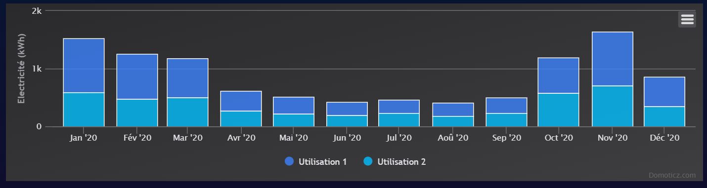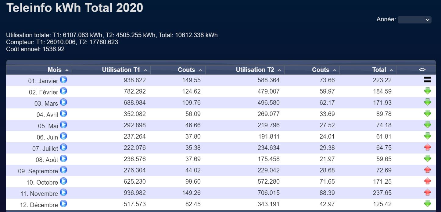 Consommation par mois depuis le début de l'année en heures creuses en heures pleines et total des 2