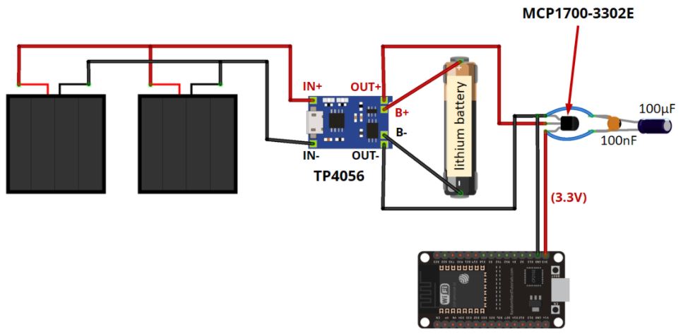 Le sujet est très compliqué. L'alimentation doit être entre 2,3V à 3,6V Les piles pertinentes sont en 3,7V. Sans doute faudra-t-il un renfort de panneaux solaires. Les régulateurs 3,3V existants demande une tension d'entrée minimum de 4,5V. etc…