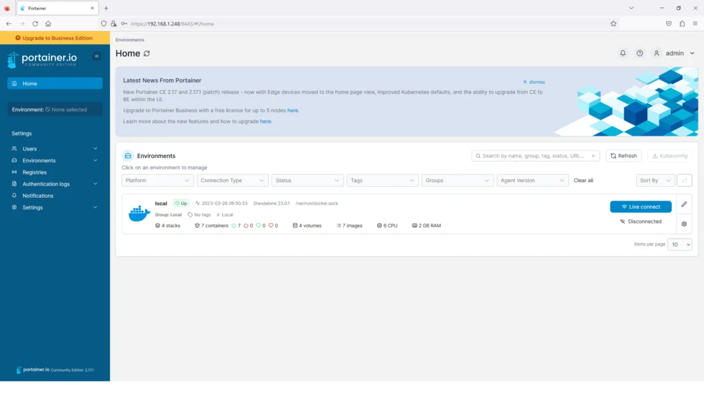 - Pour débuter, aller sur la page d’administration de Portainer.