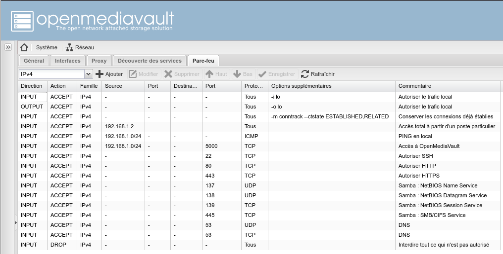 Il faudra ajouter des règles au pare-feu pour chaque nouveau service installé. Par exemple lors de l'installation de SAMBA pour le partage des fichiers (principale fonction d'un Nas).