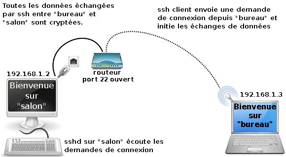 Si “geek” veut depuis l'ordinateur “bureau” être en mesure de faire les mises à jour sur “salon”, y puiser ou déposer des fichiers, et dépanner l'utilisateur “famille” qui y est connecté, le “serveur ssh” devra être installé sur “salon”, “geek” utilisera un “client ssh” depuis l'ordinateur “bureau” pour s'y connecter.