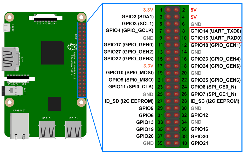 - GPIO 15 (RX) → ESP32 GPIO 17 (TX) (Réception du Raspberry Pi depuis l'ESP32) UART(2)