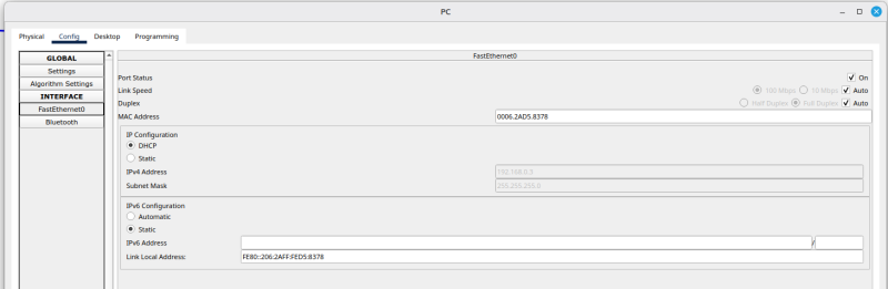 | PC | 192.168.0.2 | 255.255.255.0 | 192.168.0.1 |