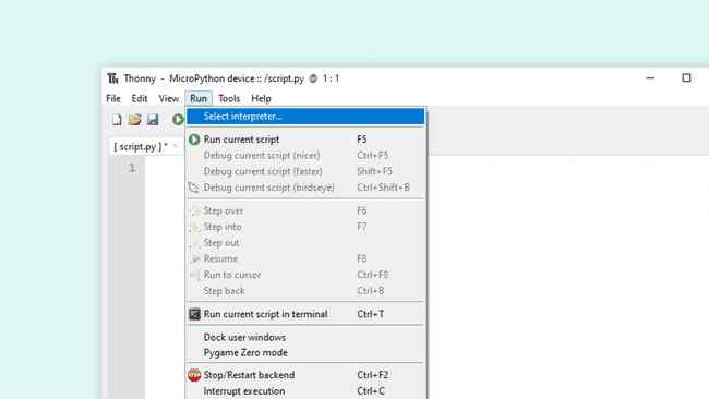 - -Dans l' éditeur Thonny , accédez à Exécuter > Sélectionner un interprète .