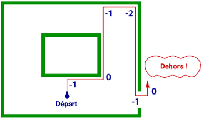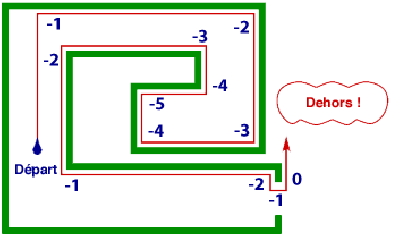 il ne suffit pas de marcher en ligne droite. Il faut compter les changements de direction. Supposons que, comme dans les exemples précédents, tous les angles soient droits. On n’a alors que deux possibilités, tourner à droite ou à gauche selon un angle de 90°. On compte les changements de direction en augmentant d’un point lorsque l’on tourne à gauche et en diminuant d’un point lorsque l’on tourne à droite (y compris la première fois que l’on tourne à droite quand on atteint un mur). Au début, le décompte est à zéro. Les deux instructions sont alors les suivantes : *1 Aller tout droit jusqu’au mur, passer à l’instruction 2 ; *2 Longer le mur par la droite (ou par la gauche, mais toujours dans le même sens) jusqu’à ce que le décompte des changements de direction atteigne zéro, passer à l’instruction 1 ; Il faut répéter ces actions jusqu’à ce que l’on revienne à la lumière du jour.
